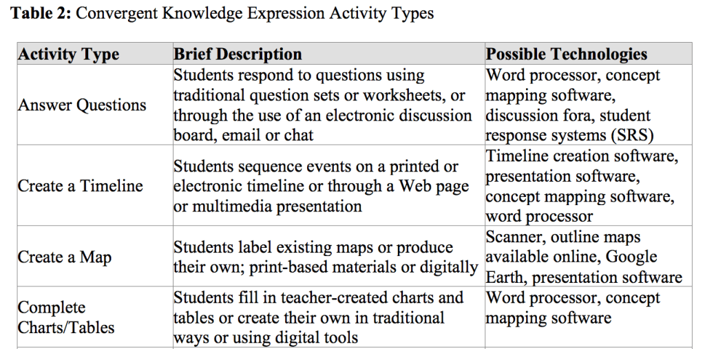 When using Learning Activity Types (LAT) to design technologically enhance learning experiences (TELEs) you will notice that LATs are organized in a table by activity type, brief description and possible technologies. The possible technologies are distinguished by type and in some instances by specific examples of one type or another. (The example that follows is from the Social Studies Learning Activity Types).
