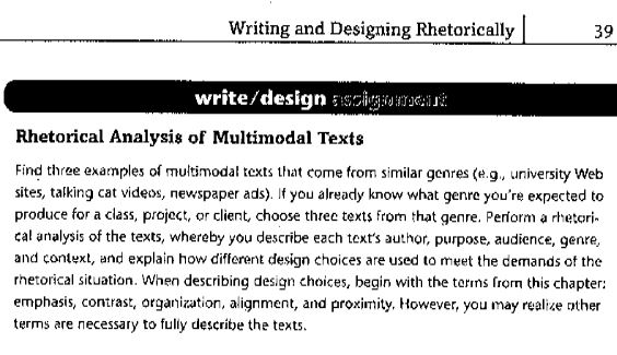 Arola, K., Sheppard, and J. Ball, C.E. (2014) Writer/designer : a guide to making multimodal projects. Boston : Bedford/St. Martins. Chapter 2: Analyzing Multimodal Projects. pp. 20-39.